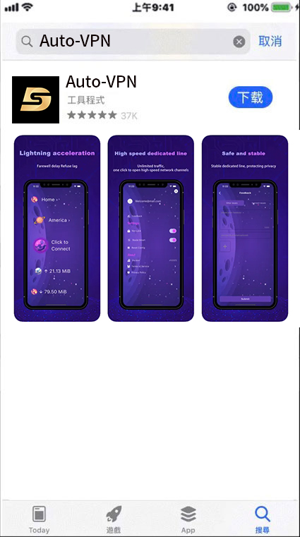 下载完成Auto-VPN 后,您可以随时把 Apple lD 切换回原来的<中国大陆>账号,当然您也可以在香港商店中下载各种海外热门应用,Auto-VPN全部都能支持!